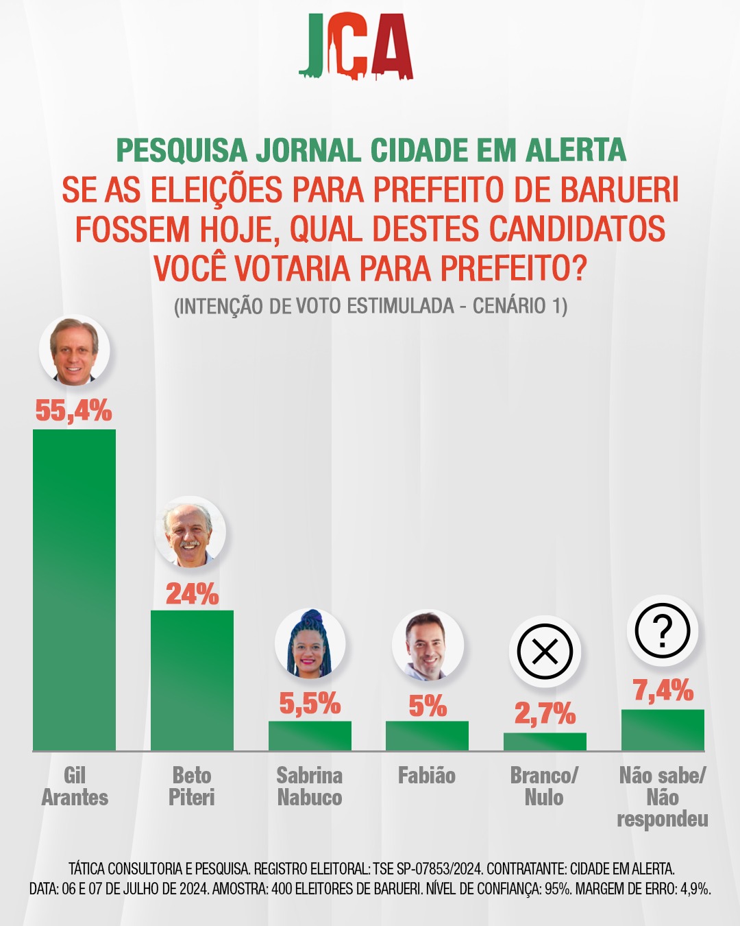 O levantamento foi realizado pela Tática Consultoria e Pesquisa, e ouviu 400 eleitores, entre os dias 06 e 7 de julho, o nível de confiança é de 95% margem de erro e 4,9% - registro TSE 078523/2024