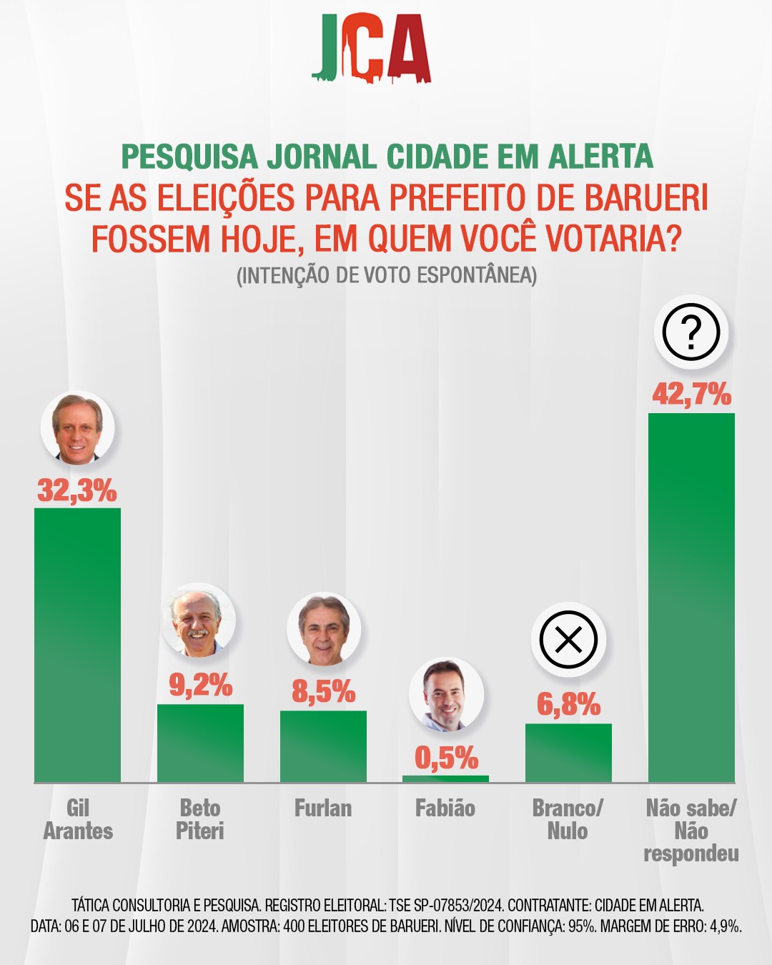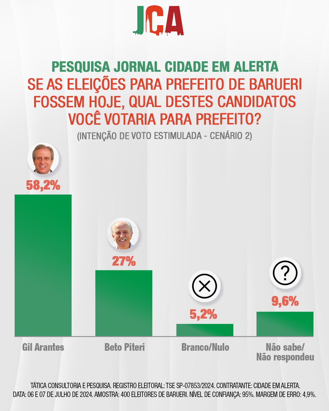 O levantamento foi realizado pela Tática Consultoria e Pesquisa, e ouviu 400 eleitores, entre os dias 06 e 7 de julho, o nível de confiança é de 95% margem de erro e 4,9% - registro TSE 078523/2024